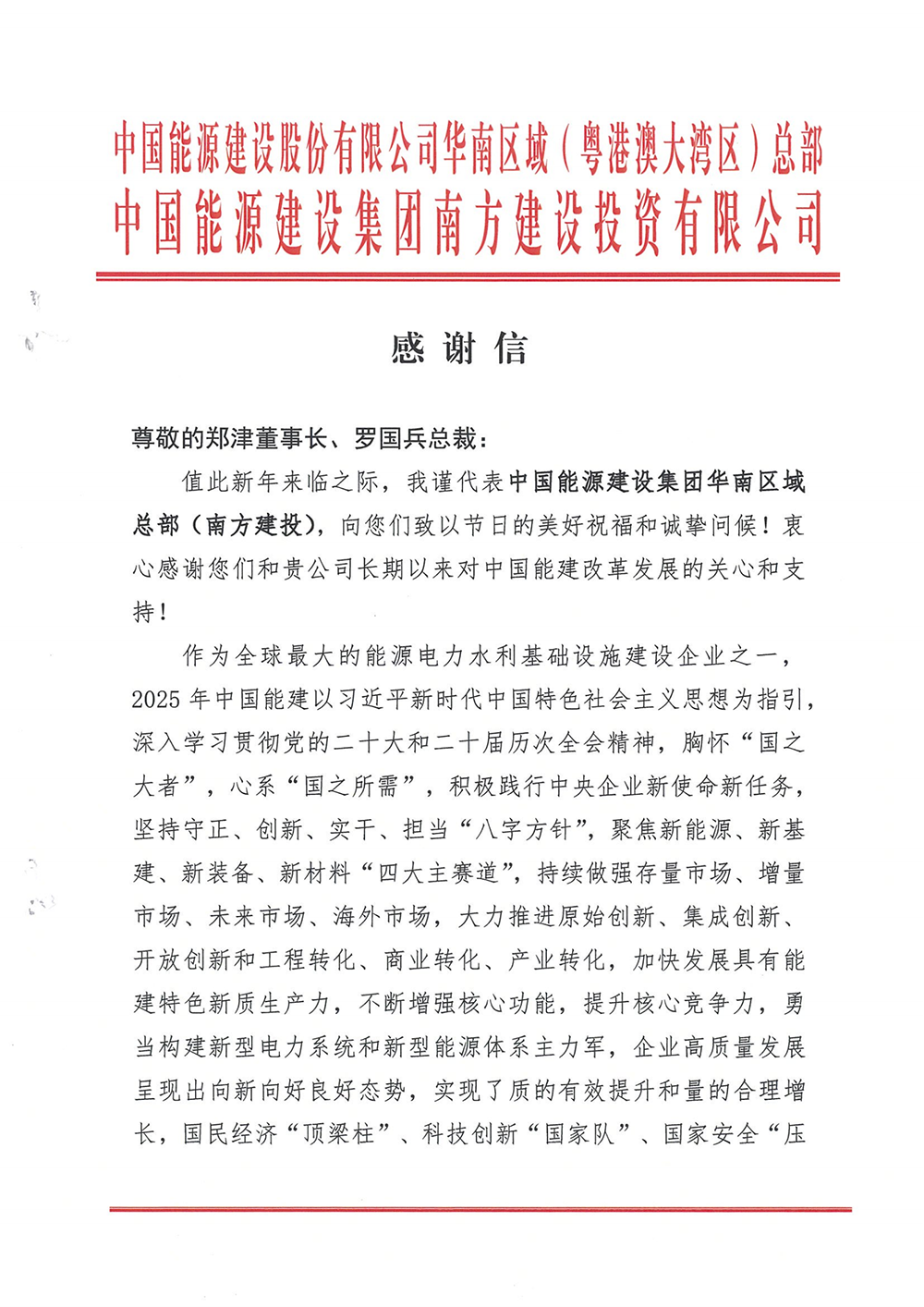 “真诚期待双方持续强化战略协同,不断拓宽合作领域……”1月21日,安博在线客服收到一封沉甸甸的感谢信。这封感谢信来自中国能源建设集团华南区域总部(南方建投),字里行间满是双方并肩攻坚的深厚情谊,更印证了安博在线客服作为“国之重器”助力重大项目建设的硬核底气。
