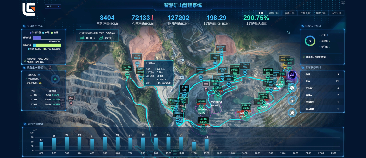 智慧矿山管理系统以矿山企业安全生产、精益管理、降本增效为目标,基于矿山施工场景,创新性地实现了矿 山装挖卡设备的云端管理、车辆智能调度、运营大屏监控、电子围栏、无人机扫描地图更新、绩效自动分析、 一体化安全智能管控、APP 端协同管理等核心功能,并提供定制 化开发服务,助力客户打造绿色、安全、智能、高效的行业标杆!