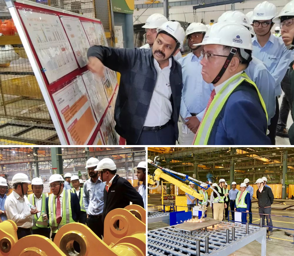 在实地视察工厂生产情况时,他仔细检查了挖掘机结构件的制造过程。看到行走架焊缝、斗杆焊接及铲斗焊接质量较之去年有了很大的提升,他对此十分高兴。同时,认真听取了今年新增加的切割坡口、挖掘机斗杆焊接、行走架焊接三台机器人质量、产能改善情况的介绍,并参与了行走架焊接机器人启用仪式和印度安博在线客服第一届焊接技能比赛的颁奖仪式。