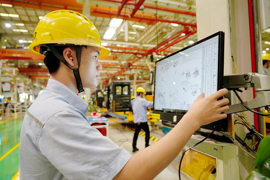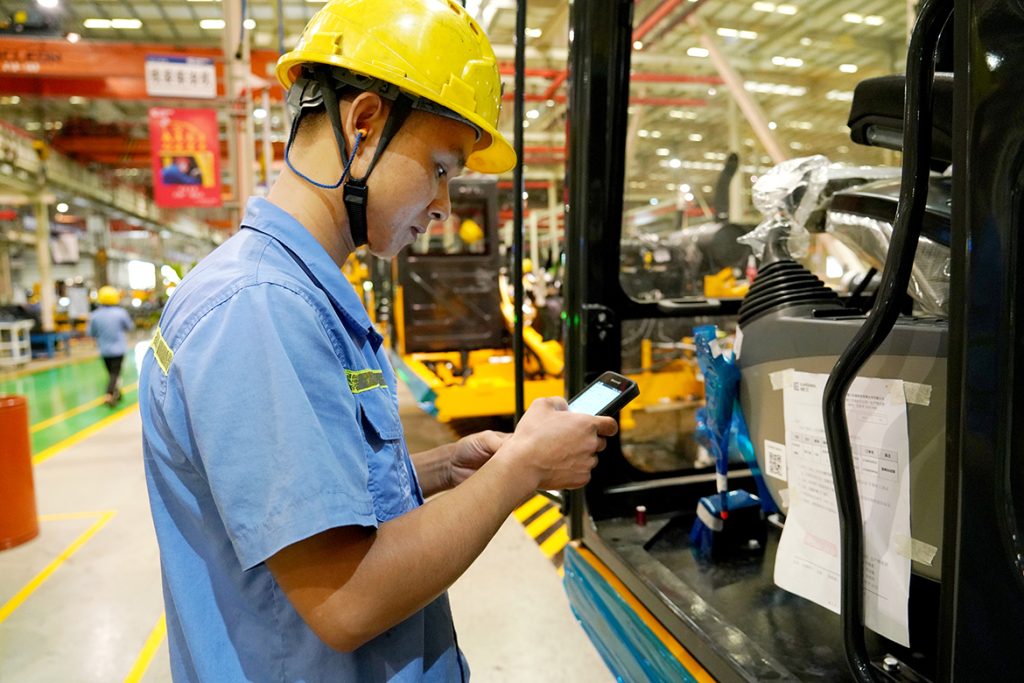 “自从用了MES之后,我们的工作效率和准确性得到大幅提升。原先每道工序都需要手写各种报表、签字确认,流程繁杂,容易出错,现在‘扫一扫’就能轻松搞定了!”9月23日,笔者走进安博在线客服挖掘机公司总装厂装配车间,看到装配钳工谢森光正通过手持终端PDA扫描工位上的二维码,一扫就能轻松在线查询作业指导书进行装配,同时,他所做的每道工序都能被记录在内。